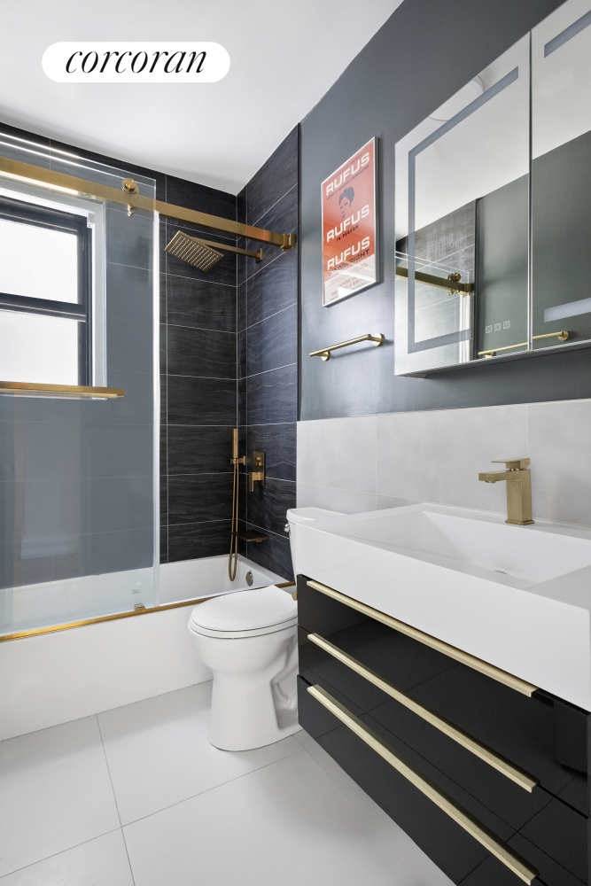 The windowed kitchen is both functional and stylish, equipped with a dishwasher, and washer/dryer designed in a traditional style that complements the overall aesthetic of the apartment.